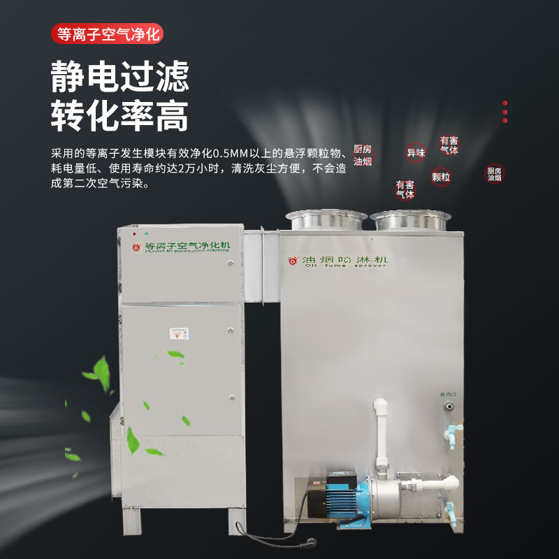 所產生的煙氣、油煙、惡臭異味等污染氣體,借助風機風力,進入油煙噴淋機,通過噴淋裝置對不同的污染氣體用不同的噴淋混合水進行噴淋霧化,使污染氣體中的大顆粒物在機內進行初效凈化,然后再進入等離子空氣凈化機對剩余的污染顆粒物,利用機內的等離子模塊進行靜電吸附在電極板表面,同時等離子模塊產生的負氧離子,對有毒有害的氣體分子進行催化氧化、分解等物理化學反應,使有毒有害的氣體分子轉化成無毒無害的氣體。